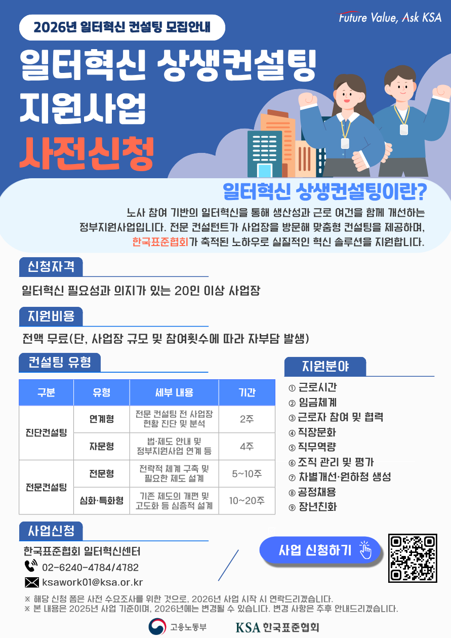 한국표준협회에서는 고용노동부 주관 「2026년 일터혁신 상생컨설팅 지원사업」에 참여할 사업장을 모집하오니,